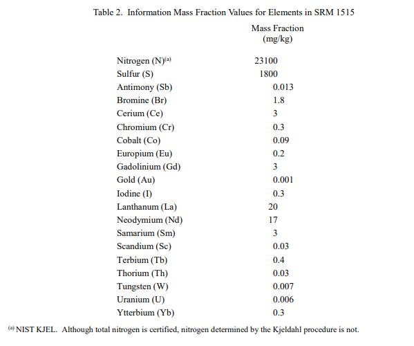 表 1 中提供了 SRM 1515 中元素的認證質量分數值,以干質量為基礎報告。NIST 認證值是 NIST 對其準確性有最高置信度的值或懷疑的偏倚來源已被調查或考慮[1]。價值分配分析由 NIST 和合作實驗室進行。認證值是使用