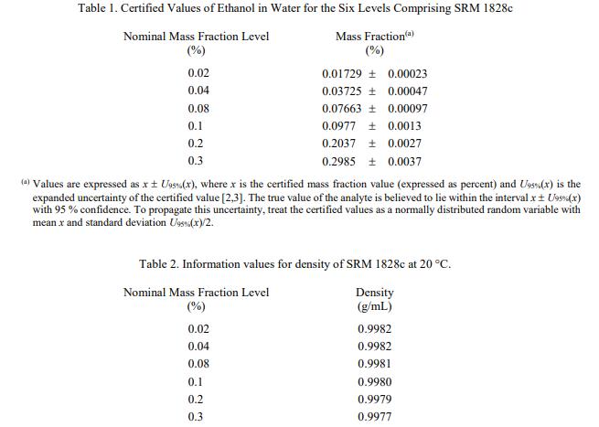 NIST SRM 1828c 乙醇-水溶液(標準品)的認證在規定的測量不確定度內有效期至 2037 年 4 月 30 日,前提是按照本證書中的說明處理和儲存 SRM(參見“操作、儲存和使用說明”) ”)。如果 SRM 損壞、污染或以其他方式修改,則認證無效。