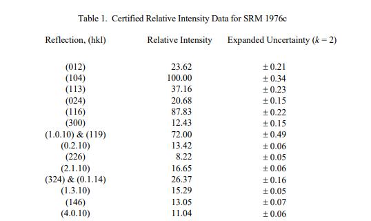 NIST 認(rèn)證值是 NIST 對(duì)其準(zhǔn)確性有最高置信度的值,因?yàn)樗幸阎蚩梢傻钠顏碓炊家驯徽{(diào)查或考慮在內(nèi)。被測(cè)量是表 1 中所示的相對(duì)強(qiáng)度(無量綱比)的認(rèn)證值,以及表 2 中所示的晶格參數(shù)。計(jì)量溯源性是國際單位制 (SI) 單位,相對(duì)強(qiáng)度值是維度為一,對(duì)于晶格參數(shù),維度是長(zhǎng)度(以納米表示)。認(rèn)證值和不確定度是根據(jù) ISO/JCGM 指南 [1] 中描述的方法計(jì)算的。