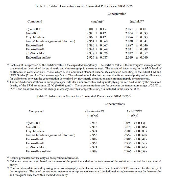 表 1 給出了八種農(nóng)藥的認(rèn)證濃度值,以質(zhì)量分?jǐn)?shù)表示。這些值基于該溶液的重量法制備結(jié)果和使用氣相色譜法確定的分析結(jié)果。 NIST 認(rèn)證值是 NIST 對(duì)其準(zhǔn)確性的最高置信度,即所有已知或可疑來(lái)源的NIST [1] 已經(jīng)調(diào)查或解釋了偏差。被測(cè)量列在表 1 中,認(rèn)證值在計(jì)量上可追溯到 SI 派生的質(zhì)量分?jǐn)?shù)單位,以毫克/千克表示。
