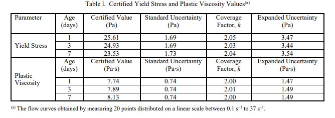 NIST 認證值是 NIST 對其準確性有最高置信度的值,并且所有已知或可疑的偏差來源都已調查或考慮在內 [1]。經認證的 Bingham 屈服應力和塑性粘度值在表 1 中給出,并且是基于在 NIST 由單個操作員使用平行鋸齒板流變儀進行的分析測量結果。粘度與剪切的完整曲線