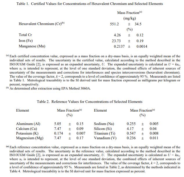 表 1 給出了 SRM 2701 中六價鉻、總鉻、鐵和錳的認證濃度。NIST 認證值是 NIST 在所有已知或可疑來源中對其準確性有最高置信度的值偏見已經被調查或考慮[1]。認證值基于兩種或多種獨立分析方法的結果一致。六價鉻的認證值是 NIST 和三個合作實驗室進行的分析測量的未加權平均值。該值基于使用經批準的美國環(huán)境保護署 (EPA) SW-846 分析方法(方法 3060A)從材料中提取的六價鉻,所有參與實驗室均使用該方法??傘t和鐵的認證值是 NIST 三種獨立分析方法結果的未加權平均值。錳的認證值是 NIST 兩種獨立分析方法結果的未加權平均值。