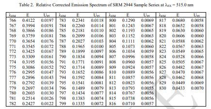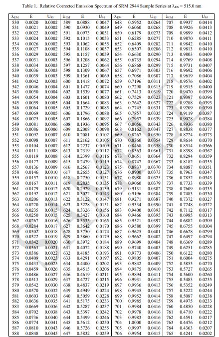 NIST 認證值是 NIST 對其準確性有最高置信度的值,因為所有已知或可疑的偏差來源都已調查或考慮在內 [1]。每個發射波長的 E 和相應總不確定度在 95 % 置信水平 U95 下的認證值在表 1 和表 2. E 的計量溯源性是 NIST 光譜輻射度標度,以相對能量單位表示。波長的計量溯源性為米的 SI 單位。