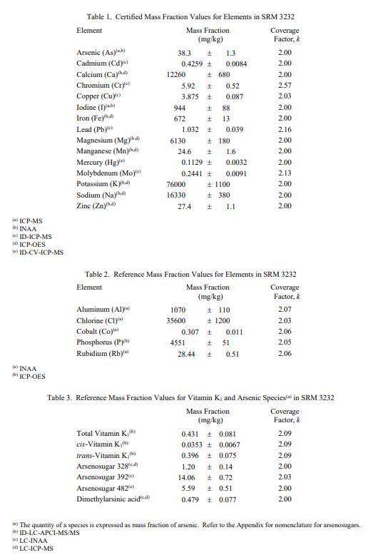 元素測定:SRM 3232 中元素質(zhì)量分?jǐn)?shù)的賦值基于 NIST 測量,使用電感耦合等離子體發(fā)射光譜法 (ICP-OES)、電感耦合等離子體質(zhì)譜法 (ICP-MS)、同位素稀釋 ICP-MS (ID-ICP-MS)、同位素稀釋冷蒸氣生成ICP-MS (ID-CV-ICP-MS) 和儀器中子活化分析(INAA)。