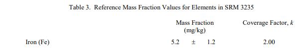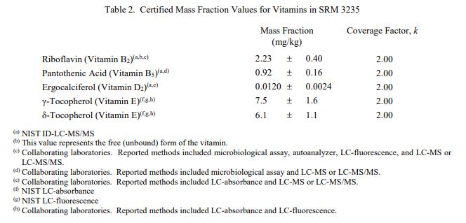 表 1 和表 2 提供了 SRM 3235 中元素和維生素的認證質量分數值,按原樣報告,在表 1 和表 2 中提供。 NIST 認證值是 NIST 對其最有信心的值準確性,因為所有已知或可疑的偏差來源都已被調查或考慮到[1]。價值分配分析由 NIST 和合作實驗室進行。