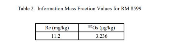 表 2 中提供的 Re 和 187O 的信息值是未經(jīng)認(rèn)證的值,沒有報(bào)告不確定性。信息值 [1] 被認(rèn)為是 RM 用戶感興趣的值,但沒有足夠的信息來評(píng)估與該值相關(guān)的不確定性。