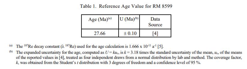 表 1 中提供了 Henderson 輝鉬礦的參考年齡。參考值 [1]是一個(gè)未經(jīng)證實(shí)的值,它是對(duì)真實(shí)值的最佳估計(jì);但是,該值不符合 NIST 的認(rèn)證標(biāo)準(zhǔn),并且提供了相關(guān)的不確定性,這些不確定性可能僅反映測量精度,可能不包括所有不確定性來源。